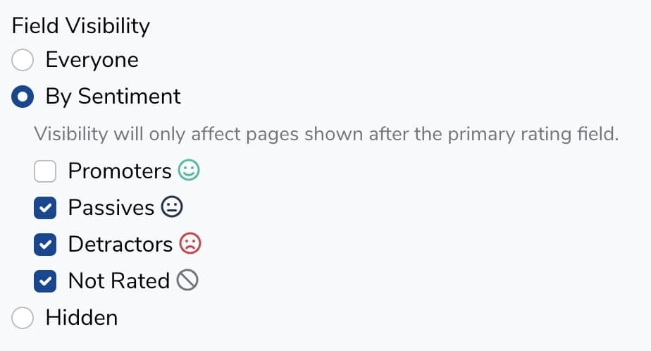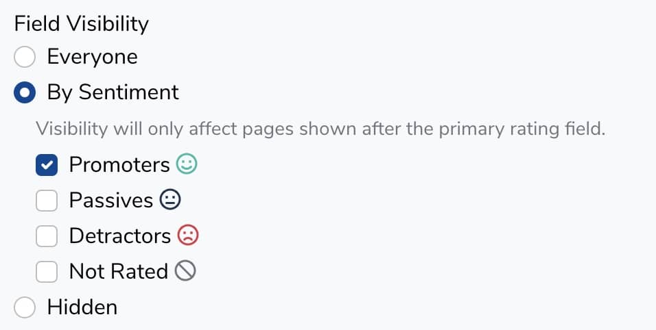 When editing a field, under “Field Visibility” select “By Sentiment”. You can then choose to show the field to any combination of Promoters, Passives, Detractors, or Not Rated.