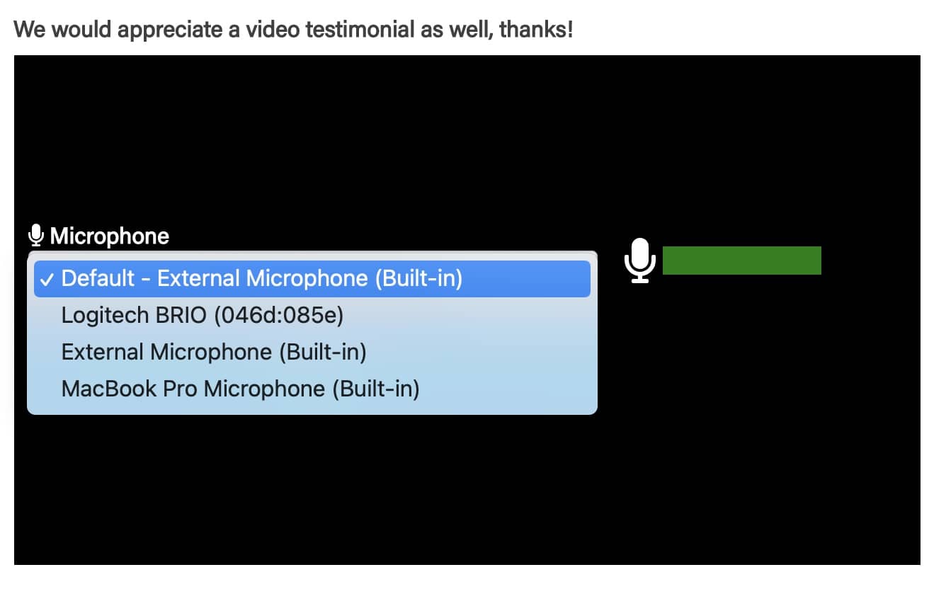 - Use the dropdowns to select your desired microphone/camera. Click Continue