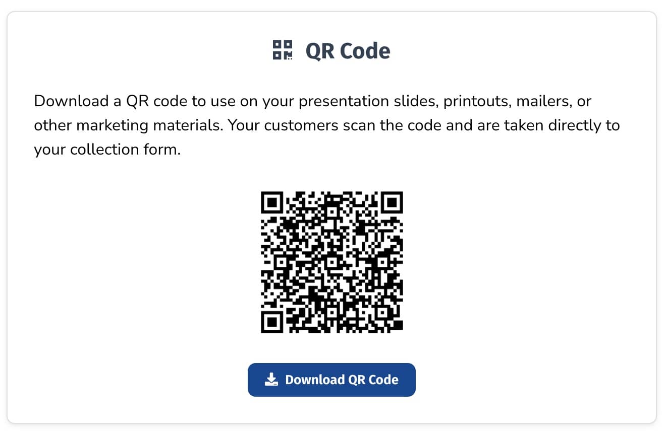 Download a QR code to use on your presentation slides, printouts, mailers, or other marketing materials. Your customers can scan the code with their mobile phone and be taken directly to your collection form.