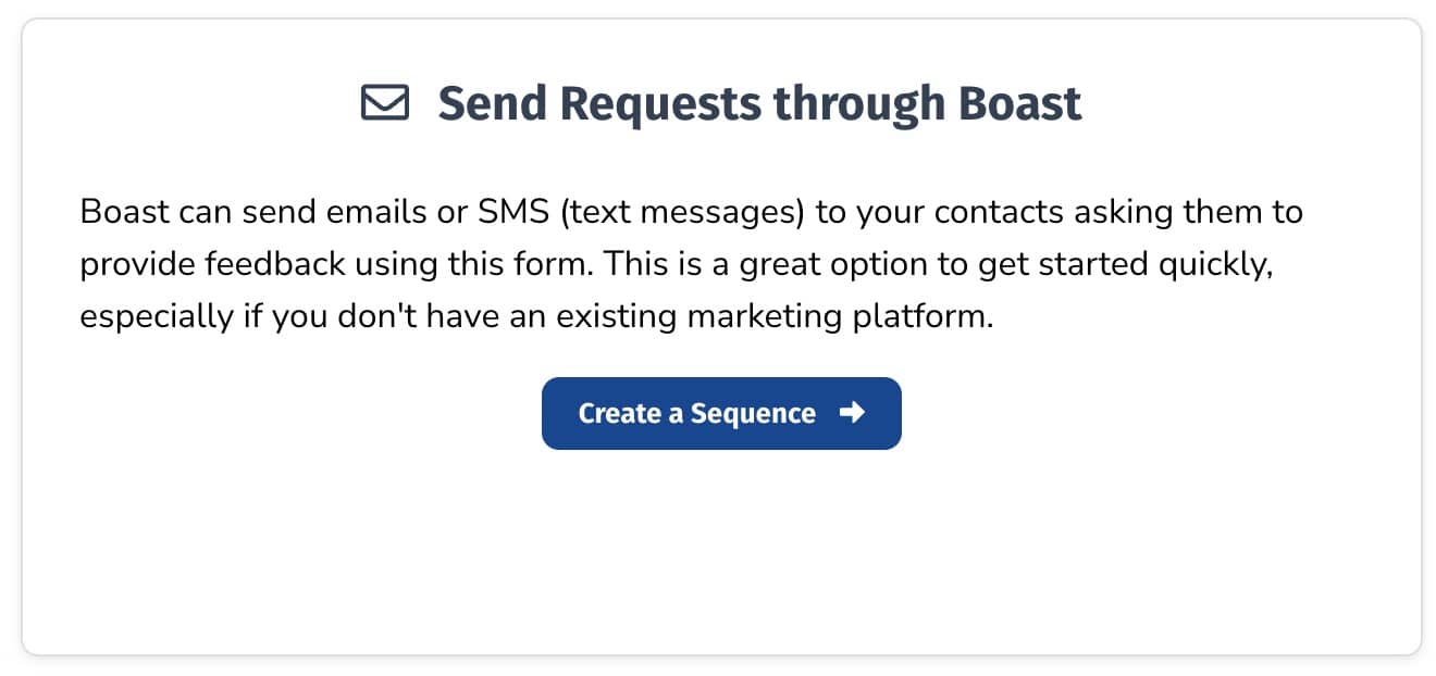Boast can send emails or SMS (text messages) to your contacts asking them to provide feedback using your form. This is a great option to get started quickly, especially if you don't have an existing marketing platform.