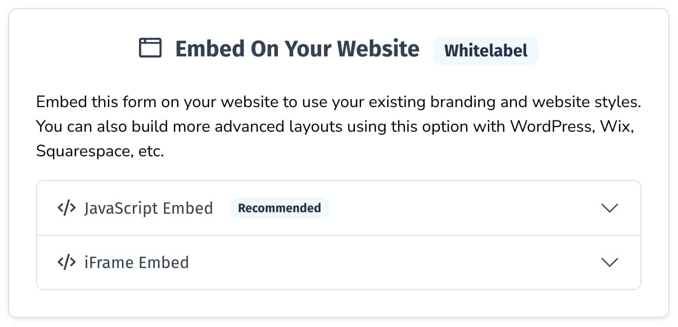 Embed your form on your website to use your existing branding and website styles. You can also build more advanced layouts using this option with WordPress, Wix, Squarespace, etc.
