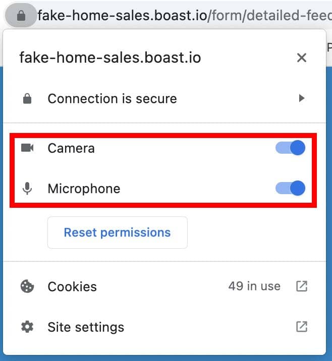 If your browser does not ask or allow camera use, please use the following steps to ensure your browser allows camera and microphone access: