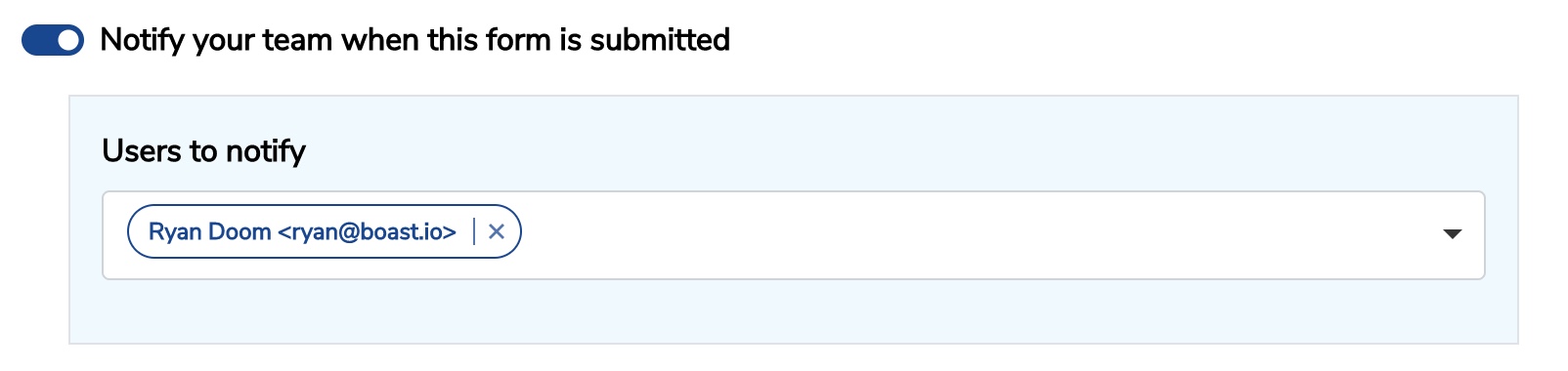 Edit a form and go to Settings > Notifications. Here you can choose who on your team will get notified of new submissions.